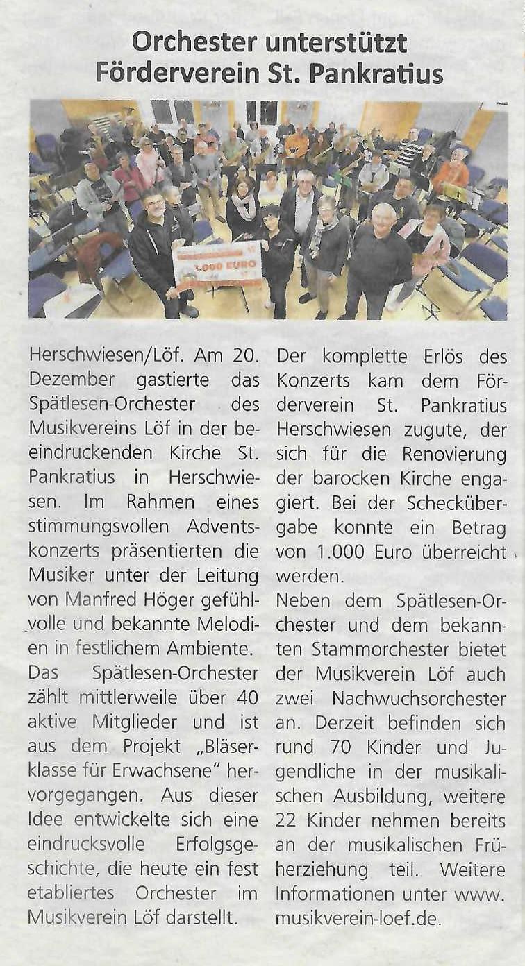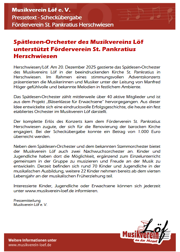 Die barocke Pfarrkirche St. Pankratius in Boppard-Herschwiesen ist besonders seit ihrer gelungenen Innenrestaurierung vor fünf Jahren einer der schönsten und klangvollsten Kirchenräume für gute Konzerte weit und breit. Seit über zehn Jahren kommen deshalb auf Einladung des Fördervereins immer wieder bekannte und erfahrene Veranstalter in das Niederkirchspiel.